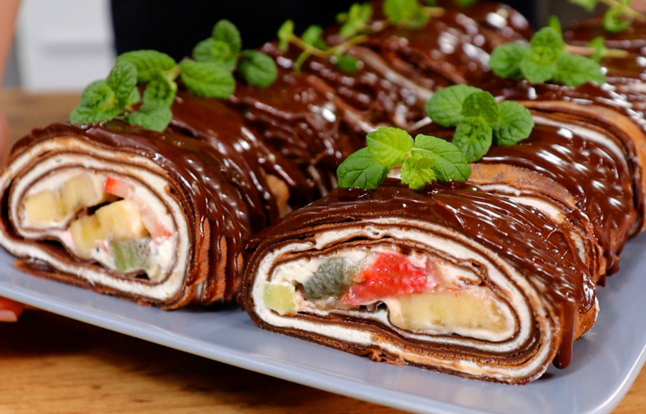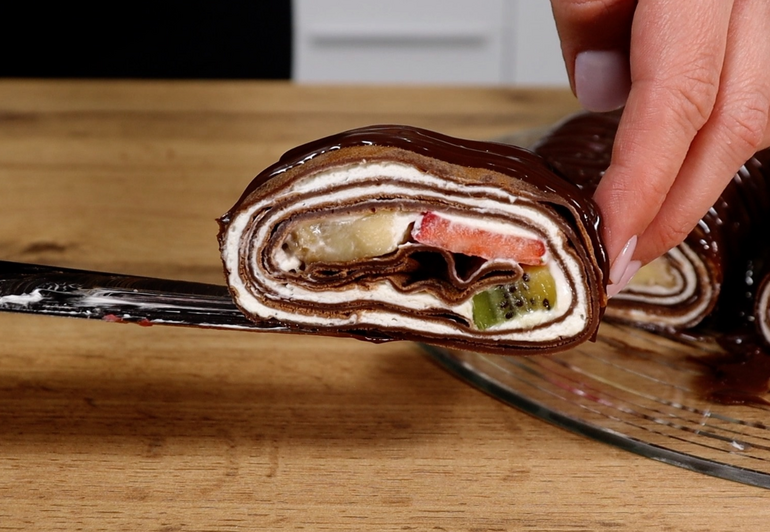 Сочетание нежного крема, сочных ягод, фруктов и шоколадных блинов – это просто блаженство. Обязательно приготовьте блинный рулет на выходных, чтобы порадовать себя и близких.
