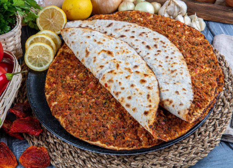 Лахмаджун часто называют турецкой пиццей, но по духу и подаче он ближе к уличной еде: его сворачивают рулетом и едят руками, добавляя свежие овощи и зелень.