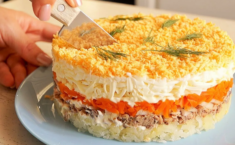 Салат «Шляпа Маномаха» в этом варианте отличается лаконичной подачей и отсутствием излишнего декора. Несмотря на название, оформление выполнено в минималистичном стиле — акцент сделан на вкусе и доступных ингредиентах. Блюдо не содержит мяса и подходит для повседневного или праздничного стола.
