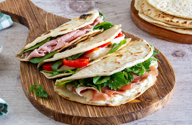 - Возьмите лепёшку из тонкого лаваша и сделайте надрез от центра к краю. Мысленно разделите её на четыре сектора.