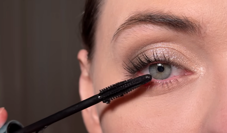 Подкручиваем ресницы и прокрашиваем их тушью. На нижнем веке тушь наношу только во внешний уголок, чтобы подчеркнуть форму глаз и создать лёгкий лисий эффект — он отлично дополняет технику V.
