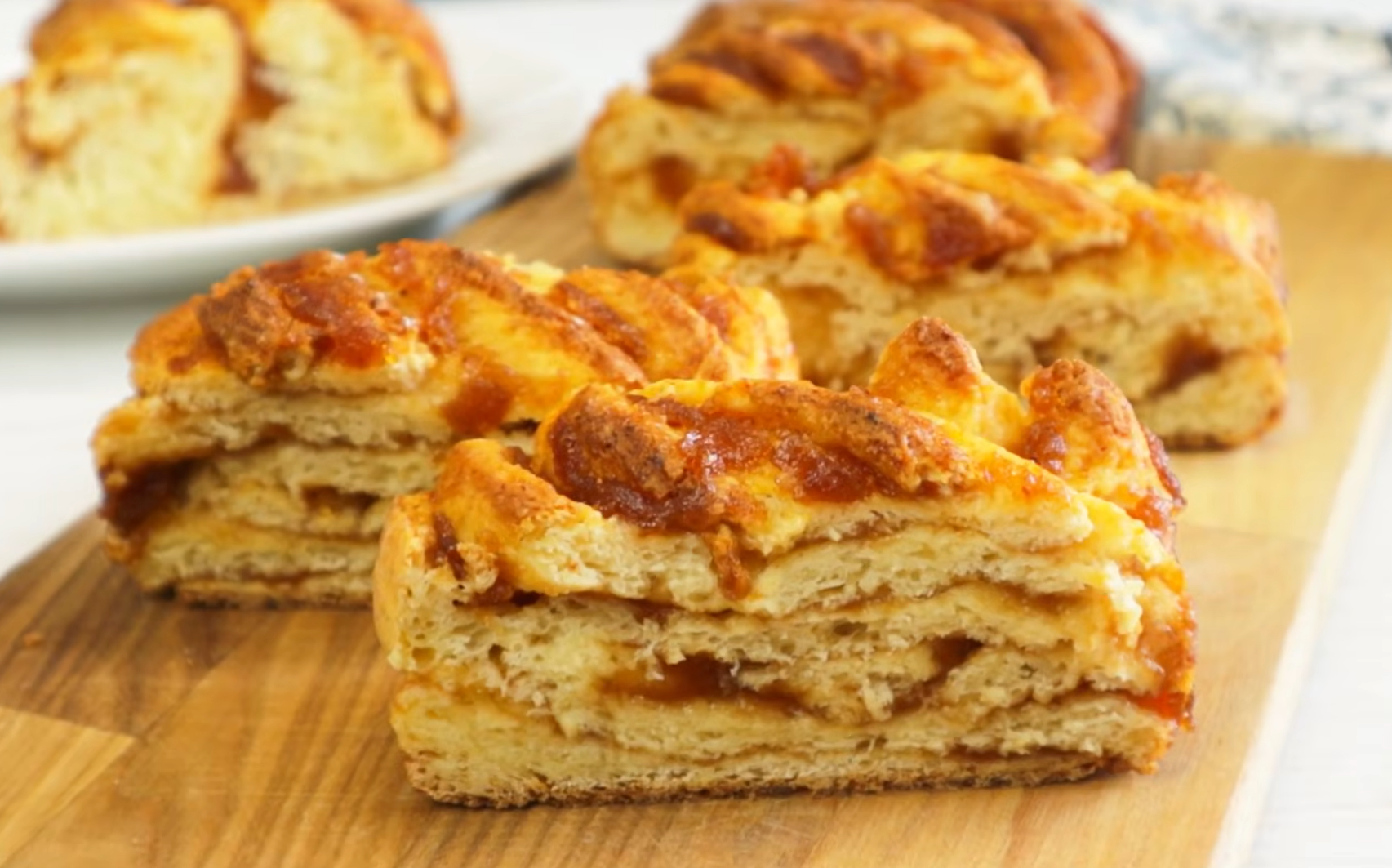 Перед подачей косичку нарезают порционными кусочками. В разрезе видны аппетитные слои теста и яркая начинка. Остается только заварить чай и насладиться домашним уютом.