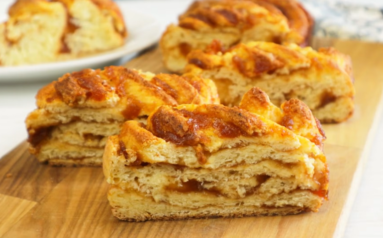 Тесто раскатывают в пласт толщиной примерно 5 мм. Поверхность смазывают густым вареньем или джемом, распределяя ровным слоем.