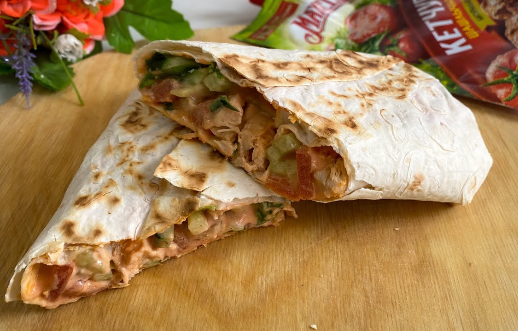 - На разогретой сковороде обжариваем лаваш по 1 минуте с каждой стороны. Шаурма готова.