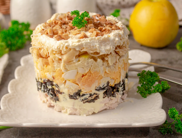 Этот салат способен стать настоящим открытием для праздничного стола. Он сочетает в себе свежесть цитрусовых, нежность курицы и насыщенный вкус чернослива и орехов — классическая новогодняя комбинация, знакомая многим с детства. Готовится блюдо буквально за несколько минут, а результат удивит даже гурманов.