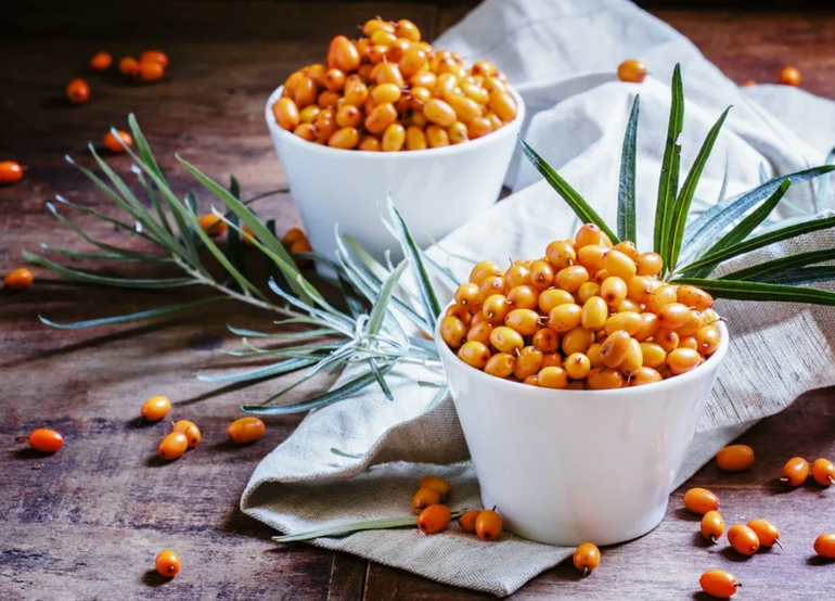 Облепиха богата витаминами и биологически активными веществами. В её составе — витамин C, витамины группы B, каротин, железо, витамин E, эфирные масла и антиоксиданты. Особенно ценится высокая концентрация аскорбиновой кислоты, благодаря которой облепиха эффективно поддерживает иммунитет и часто используется в осенне-зимний период.