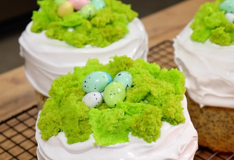Если хотите сделать «землю» под мхом, можно использовать измельчённое печенье Oreo. Такой декор отлично сочетается с цукатами, орехами или маленькими шоколадными фигурами (перепелиными яйцами, зайцами).
