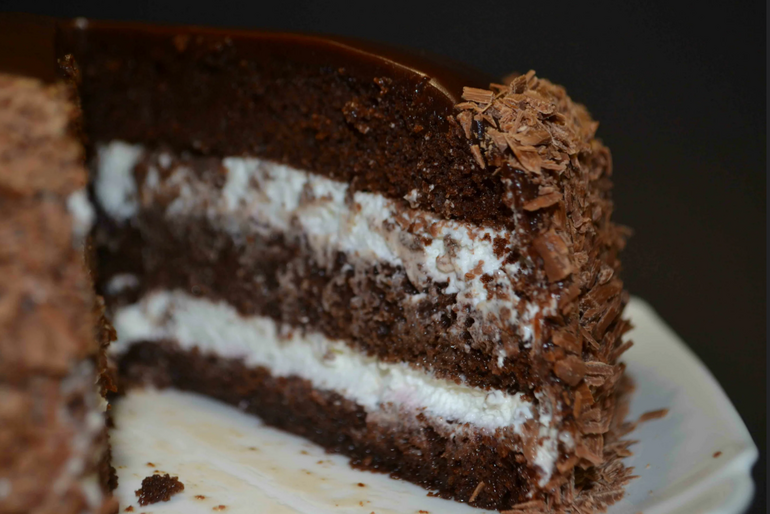 Корж может немного осесть — это нормально, так как тесто достаточно плотное. На вкус он напоминает насыщенную шоколадку.