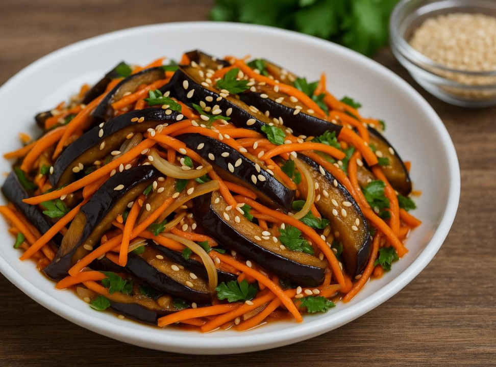 - Смешать все овощи с обжаренными баклажанами и приправить солью, сахаром, уксусом, кунжутным маслом, кориандром, черным перцем, кунжутными семенами и кинзой, поставить салат из баклажанов по-корейски в холодильник на 2 часа и можно подавать к столу.