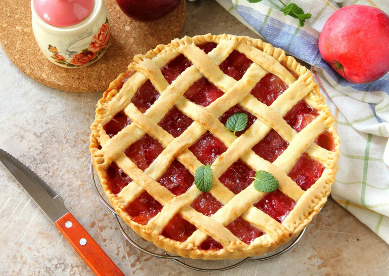 Готовый пирог — это настоящий аромат осени: нежное песочное тесто, сочная яблочная начинка и лёгкий аромат корицы, который наполняет дом теплом.