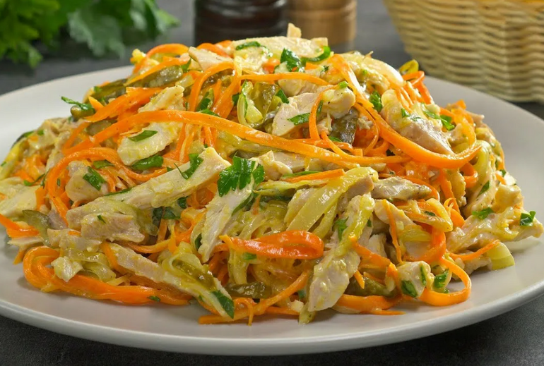 Популярный салат «Обжорка», приготовленный с отварным куриным филе, с золотистым жареным луком и морковью, с добавлением соленого огурчика и специй. Приготовить просто, получается всегда вкусно!