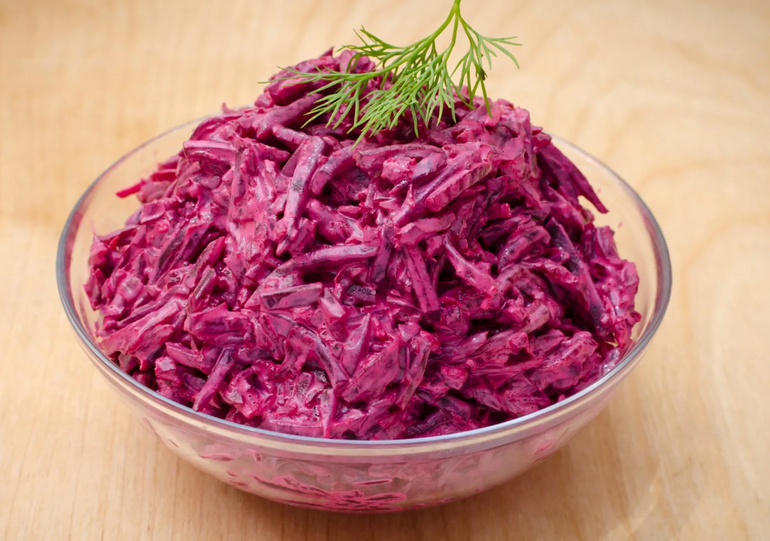 Свёклу очищаем и натираем на крупной тёрке. Затем хорошо отжимаем лишнюю жидкость — это важно, чтобы салат не получился водянистым.