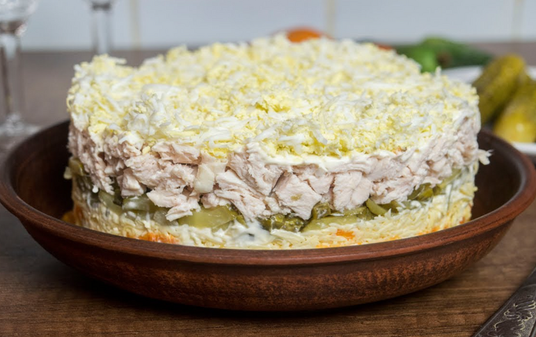 На первый взгляд — это самый обычный куриный салат. Но стоит лишь попробовать, и вы поймёте, в чём секрет: сочетание свежих и солёных огурцов придаёт блюду особый вкус и лёгкую пикантность.