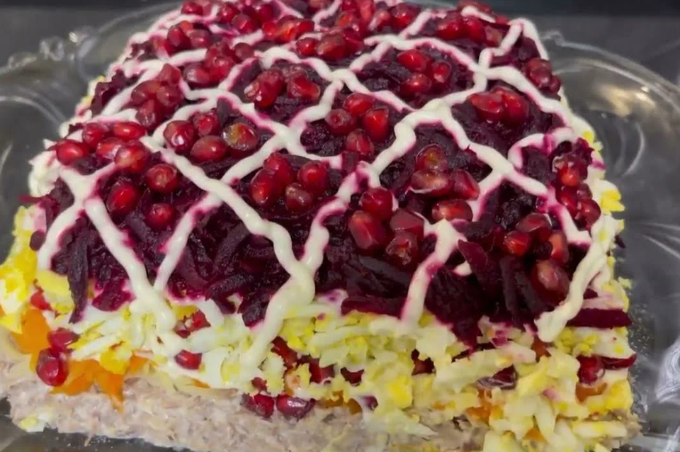В завершение салат покрывают оставшейся свеклой, аккуратно распределяя её по поверхности.