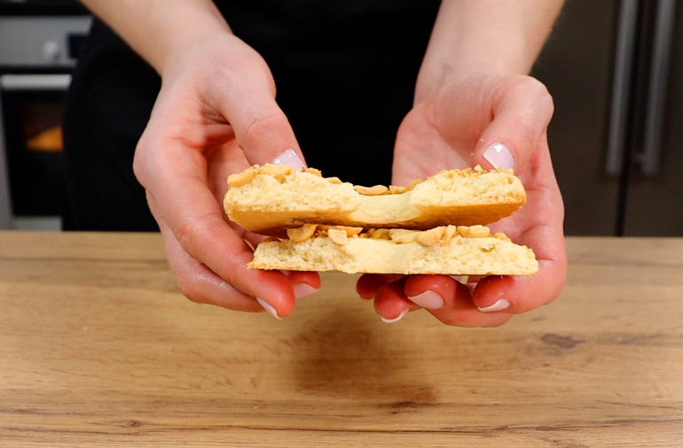 - Смешиваем 1 желток и 1 ст.л. молока в небольшой ёмкости. Не смазывайте все кольца сразу, делайте это поэтапно. Смазали одно кольцо полученной смесью – щедро посыпали арахисом, смазали другое – посыпали и т.д. Это необходимо, чтобы яичная смесь не успела подсохнуть, и арахис надёжно прилип к печенью.