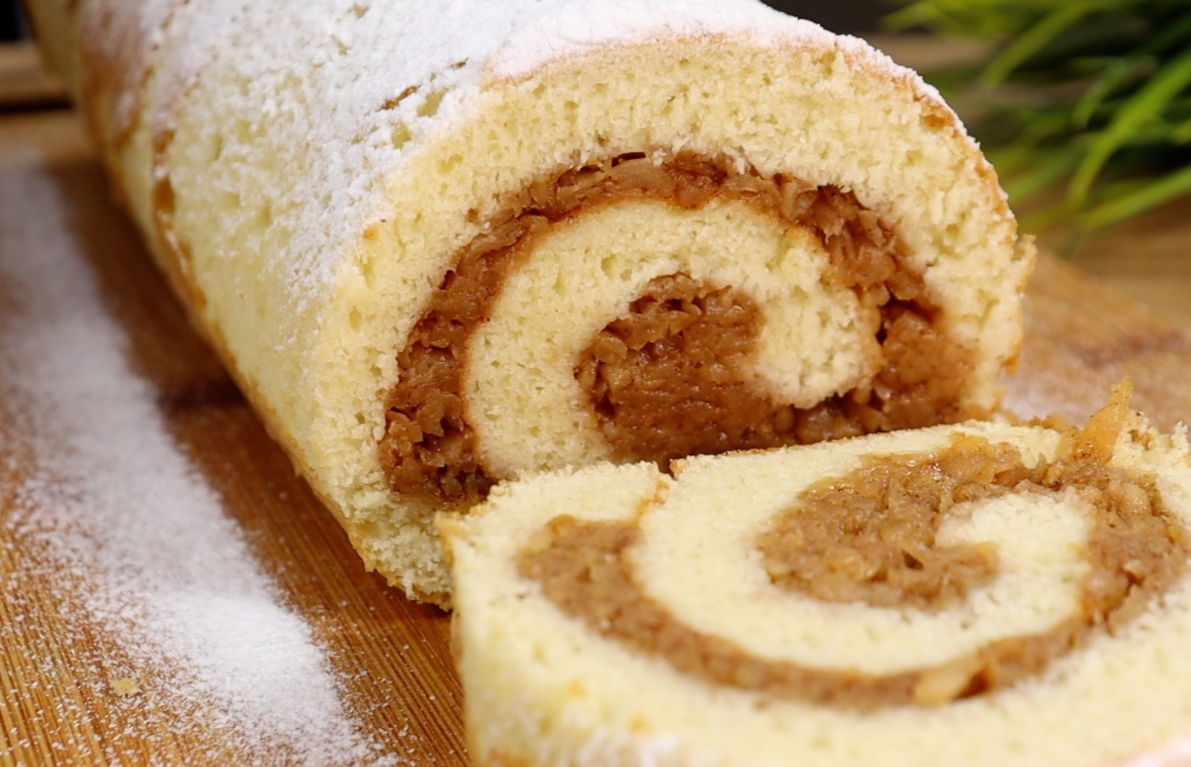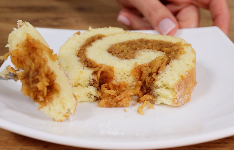 - Оставляем рулет в свёрнутом виде до полного остывания на решётке. Это займёт примерно 2 часа. За это время структура бисквита стабилизируется, а яблочная начинка немного пропитает корж.